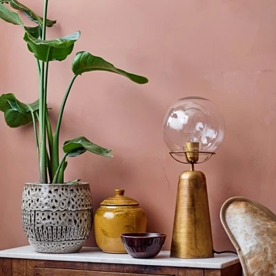 This unique lamp is the perfect statement piece for any eclectic or vintage home. This lamp is metal and has a unique, antique brass base which makes it a perfect statement piece. It also has a glass shade, which makes it easy to match with anything. This lamp also has a convenient inline switch.