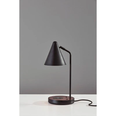 An essential addition to your workspace, the Oliver AdessoCharge Desk Lamp includes a wireless charging pad with Qi inductive charging technology. A matte black finish is mixed with walnut wood for mid-century modern appeal. Adjust the shade to direct the light where it is needed. Many smartphones (list below) have Qi technology built in, so just place your phone on the pad and it will charge right up. No cords, no mess. It’s that easy! All AdessoCharge product is Qi certified by the Wireless Power Consortium. AdessoCharge is unique in that you can use the AdessoCharge pad, the USB and the light all at the same time with maximum efficiency of all three. An easily accessible rocker switch on the base turns the lamp on and off. Just plug in the lamp and the charger will work. This wireless charging pad will charge your phone through most materials, do you do not even need to remove your case! Only metal will hinder the function of the charging pad to charge through the case. If your smartphone doesn’t support Qi wireless charging, you will need to purchase a Qi compatible case, which is sold through a variety of retail channels. Or you can also charge your smartphone with the USB port that is also included in the lamp base. Compatible with Apple iPhone 8 / 8 plus / X / Galaxy Note 8 / S8 / S8 plus / S7 / S7 edge / S6 / S6 edge / S6 edge+ / Nexus 4 / 5 / 6 / 7 / LG G3/ Microsoft Lumia 1520, 1020, 930, 929, 928, 920