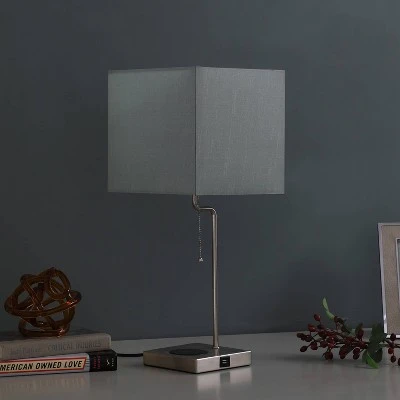 Modern Ashton Square Table lamp feature a Wireless Charging Pad with Qi Technology and a USB port for convenient charging. With Qi integrated into many smartphones, charging is easier than ever—no charging blocks or cords required. Design a workspace or reading nook that’s primed for productivity, you can charge up without cords or clutter. An elegant & practical solution: This lamp does not have the glare of overhead lights or exposed bulbs as its neutral linen shade softens the light giving your room a warm ambient glow. The unique modern style and size of this lamp makes it the perfect bedside table, office lamp, or living room side table lamp. Contemporary design and features a metal construction with a top w/ a Blue Green Textured Square Drum shade. Convenient Pull Chain: With the stylish pull chain, you can turn ON/OFF with the pull chain. No need to find the switch on the cord when you are going to sleep. Super convenient for your bedroom. The charging port and pad function regardless of whether the lamp is on or off. Add this table lamps to your bedroom, office or living room for a dash of delightful symmetry and visual allure.