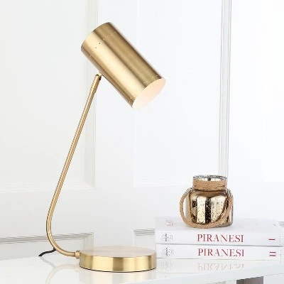 Bring form and function to any living room or home office with the clean lines and curves of this contemporary table lamp. Finished in a shimmering gold hue, its mid-century style adds character while its shade directs light exactly where it’s needed. Its sleek design displays an air of minimalist style and illuminates your space in a cool manner. This table lamp by Safavieh contains one LED 9W bulb requiring an E26 Screw Terminal base. It has an online on / off switch.