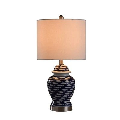 You do not have to live right by the sea to enjoy the School of Fish table lamp. The ceramic and steel lamp comes with a blue finish while the fish stand out in white. The navy blue coloring complements the base nicely, and you also get a durable shade made out of styrene. A handpainted finish means each piece is unique, with possible slight variations. No two lamps are exactly alike. This piece exemplifies superior product design and great styling. It will pair well with coastal styling and is sure to be a conversation piece. Regardless if you put it in the bedroom or family room, this table lamp stands out. Suitable for residential use in a dry location. This modern table lamp is UL listed in compliance with the nationally recognized safety standards.