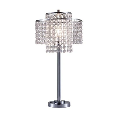 A cascade of hanging Acrylic beadings embellishes this striking 2-Tier chandelier-style Holly Glam table lamp with innovative charging station and USB Port. Hanging acrylic accents add another dimension of style to this stunning table lamp. The sleek striking silver chrome finish base is embellished. In the lamp base is a built-in 120-Volt electrical outlet and a USB port so you can recharge mobile phones or other electronic devices. This table lamp is perfect for transitional and convenience settings and contemporary rooms. Glam it up, This Holly Glam Silver Chrome Table Lamp add elegance to your home. A perfect addition for any home and exudes glamour. Fully assembled outer tier shade measures 12 in. L x 12 in. W x 7.5 in. H, inner tier shade measures 6.75 in. L x 6.75 in. W x 11 in. H. A built-in 120-Volt electrical outlet and a USB port so you can recharge at your convenience. Comes with a 4 in. L x 8.5 in. H chrome harp with a 0.25 in. L x 0.75 in. H cylindrical gold finial. Table body measures 1 in. Dia body pole x 17.5 in. H. Table base measures 6 in. Dia x 1 in. H. Bulbs: 1pc 100-Watt MaxType A (E26) incandescent bulb only (not included), CFL and LED bulbs compatible.