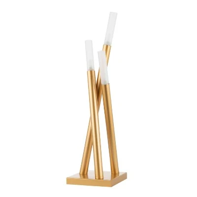 Cylindrical frosted sconces create a soft glow, accenting the modern design of the tubular metal arms on the Icicle Lamp. If you like a subtle contemporary look, this lamp is a perfect choice. Uses three 40-watt G9 halogen bulbs. This is the piece you’ve been looking for to elevate your decor! Available in brushed nickel and gold finishes.