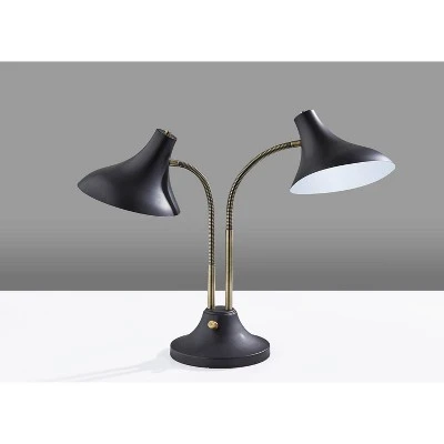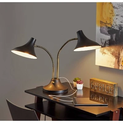The Ascot Table Lamp mixes style and functionality in the best way. Black & antique brass metal finishes and two abstract shaped shades work together to create a classic mid-century modern silhouette. Two gooseneck arms allow for the light to be directed exactly where it is needed. A simple rotary switch has 4 settings: left light on, right light on, both lights on, off. Charge up your mobile devices using a convenient USB port located on the base.