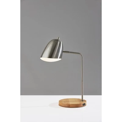Taking its cue from mid-century modern and industrial designs, the Jude desk lamp by Simplee Adesso is the perfect addition to your home or office. The round 8″ diameter base is constructed of rubberwood with a natural finish that beautifully complements the brushed steel finish on the metal stem and curved bell-shaped shade. For directional lighting options, the 19.5″ tall lamp offers an articulation point at the base of the shade, allowing you to direct the light wherever it’s needed. The lamp also has an AC outlet built directly into its base for convenient access to power right from your desktop. Whether the lamp is turned on or off, the AC outlet will keep working normally. Operated by a rotary switch located on the shade to easily turn it on or off, the lamp powers a 40W bulb (not included) and features a 5′ clear cord. The Jude desk lamp is also available with black metal and walnut wood finishes.