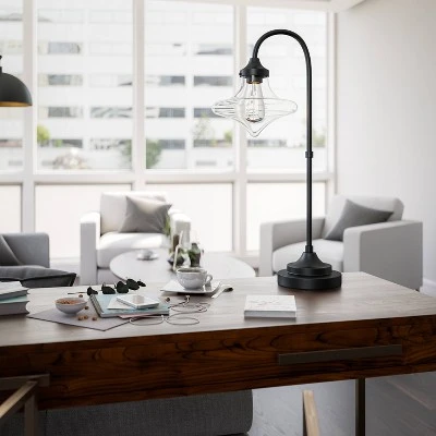 A futuristic and fun shade design is repeated throughout the modern industrial profiles of this funky table lamp. While the bronze finished body and hardware accents of this lamp are visually appealing, the uniquely âdropâ shaped iridescent amber glass shades act as the central design piece, and beckon for attention. Intended for use with a vintage Edison bulb, now included, the unique contours of these glass shades warp and distort the view of the filament, creating a unique and spacey presentation of light.