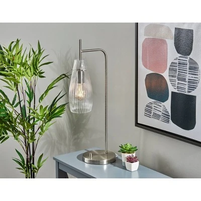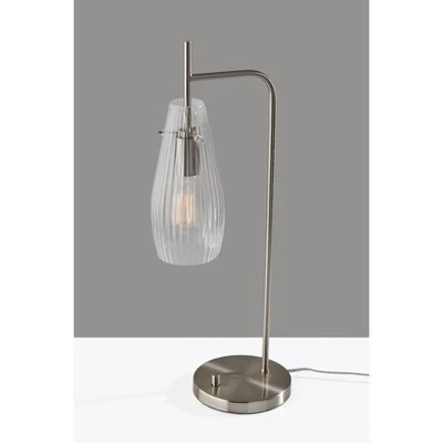 Add an elegant blend of mid-century modern and vintage design to your home with the slim silhouette of the brushed steel and glass 25.75″ tall Layla desk lamp. The brushed steel finish accentuates the round base, thin stem, and socket while beautifully complementing the clear ribbed glass of the long and slender shade. With its open-bottomed tear-drop shape and ribbed texturing, the shade adds a distinctive look that leaves a 60W bulb slightly visible while softly diffusing the light. Operated by a rotary switch in brushed steel located on the round, 7″ diameter base to easily turn it on or off, the desk lamp also features a 70″ clear cord. Complete your dĂŠcor with the coordinating Layla floor lamp, wall lamp, and pendant lighting.