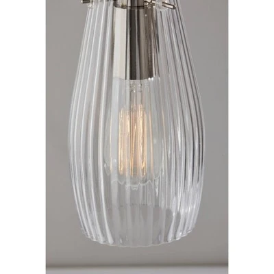 - A 60W bulb is slightly visible through the clear ribbed glass shade.