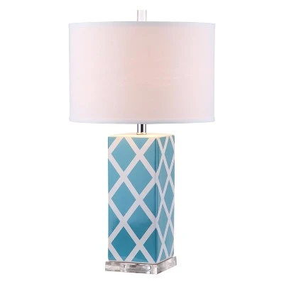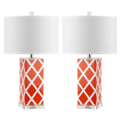 The Safavieh Pachio Set of Table Lamps make a colorful modern addition to your living room, bedroom or study. These table lamps have cubical ceramic bodies printed with a colorful diamond pattern that’s crisscrossed by stark white lines. Each lamp has a clear acrylic base and a white cotton lamp shade in a drum shape. Clear rod finials add a final stylish touch. This table lamp by Safavieh is available in a variety of colors to best suit your personal tastes and decor.