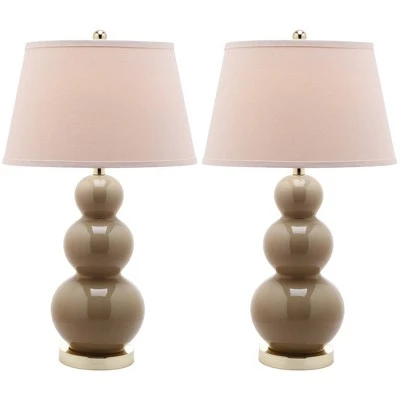 Balance fashion, form, and function with the Pamela Triple Gourd table lamp, its beautifully turned taupe ceramic gourds graduating in size. With brushed gold stand and fittings, and crisp white cotton tapered shade, Pamela adapts to any setting. Sold in sets of two. This set of two lamps are perfect for Glam or Transitional style homes.