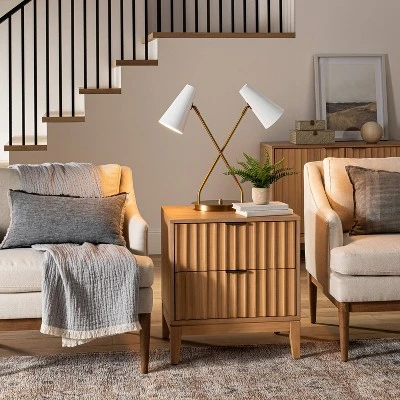 Brighten up your living room, home office or guest room with the stellar style of the Dual-Head Metal Desk Lamp from Threshold™ designed with Studio McGee. Crafted from metal, this decorative table lamp features two slender tubular metal arms that crisscross and stand on a round base, reflecting glam shine in an antiqued gold brass finish with a statement look. The two cone-shaped metal shades in bright white hang downward from the tubular arms to offer a striking contrast while helping to direct light and bathe your desk or end table surface in a soft glow. Made easy to use with a touch-activated sensor and one-way light setting, this freestanding lamp lends both style and shine to your space no matter where you place it.